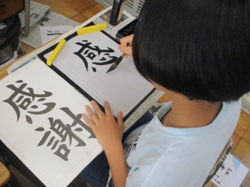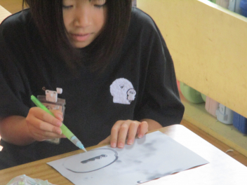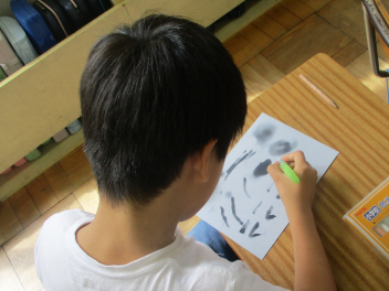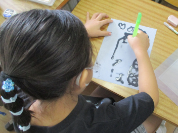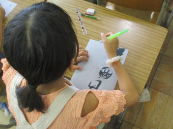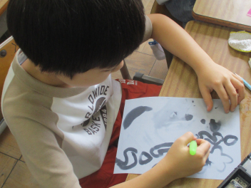 • 2年生の書写の授業で、水筆を使って自分の名前を書いたり、線や絵を描いたりして筆の面白さを味わっていました。