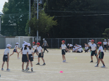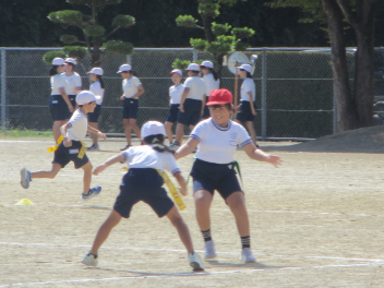 4年生は、運動場で「フラッグフットボール」をやっていました。