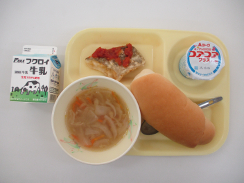 今日の給食は、パン・牛乳・たらのトマトソースかけ・ジュリエンヌスープ・ヨーグルトでした。