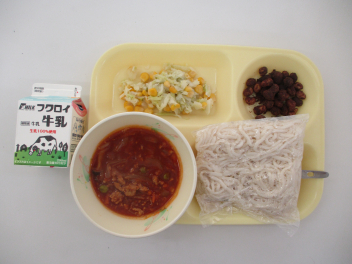 今日の給食は、ソフトめん・牛乳・きのこソース・コールスローサラダ・ココアまめでした。