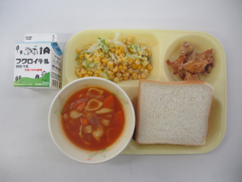 今日の給食は、パン・牛乳・鶏肉の米粉揚げ・コーンサラダ・ミネストローネでした。