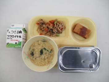 今日の給食は、収穫祭の行事食で、ご飯・牛乳・五目ちらし・豆腐田楽・むらくも汁でした。