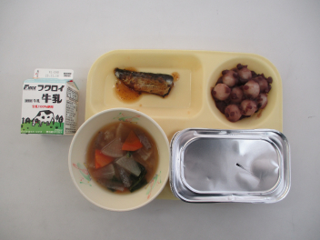 今日の給食は、ご飯・牛乳・いわしの生姜煮・実だくさん汁・ぜんざいでした。