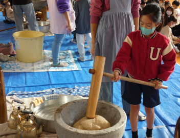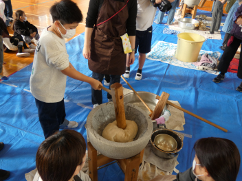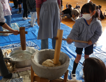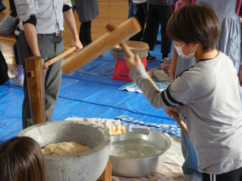 杵をしっかり持ちあげて、力強く餅をつきました。