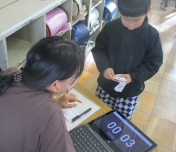 ばらばらにした九九カードに挑戦し、合格シールをもらっていました。