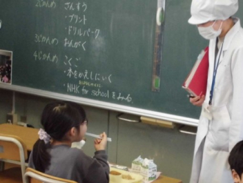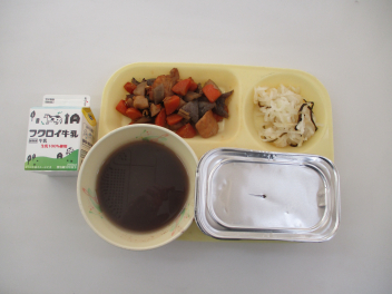 献立は、ご飯・牛乳・いりどり・大根の浅漬け・おしるこでした。