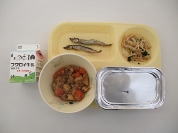 3学期最初の給食は、ご飯・牛乳・ぶりフライ・じゃがいものそぼろ煮・味噌汁でした。