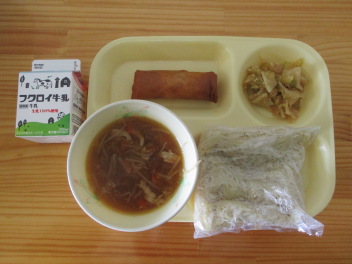 今日の給食は、醤油ラーメン・牛乳・春巻き・セロリの南蛮漬けでした。