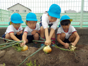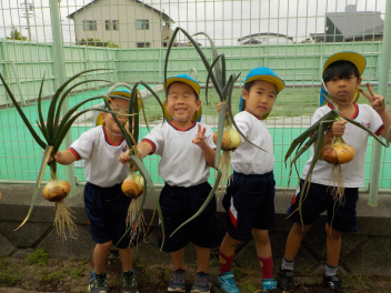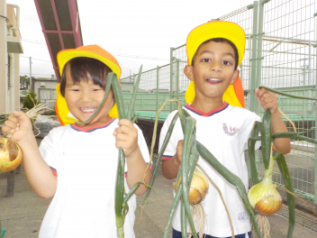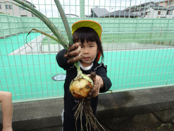 大きく育ったタマネギが抜けて大喜びの子どもたち。