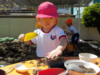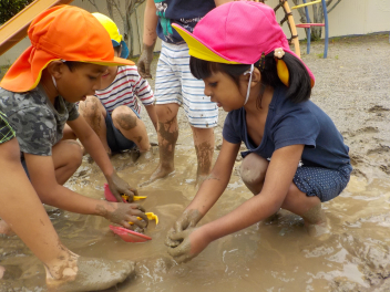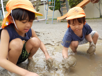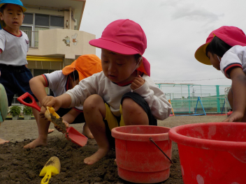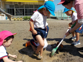 少しずつ暑くなってきて、砂・土・水を使った遊びがダイナミックになってきました。