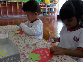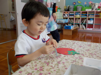 シールやクレパス・のりを使って、イチゴを作ったり、こいのぼりを作ったりしながら楽しんでいます。