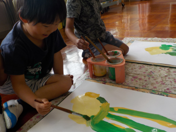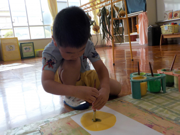 りす組さん、ほし組さんは、絵の具を使ってタマネギの絵を描きました。