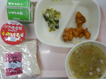 今日の給食は 「 しょくパン 牛乳 まめのスープ マーシャルビーンズ ヨーグルト ほきのりんごソースあえ チンゲンサイとはくさいのサラダ 」でした 食事の前と後のあいさつ「いただきます」と「ごちそうさま」をしっかりと言うことは、食事の時の大切なマナーのひとつです。この言葉には食べ物を育ててくれた人 、料理を作ってくれた人 、そして命ある食べ物への感謝の気持ちが込められています。心を込めて、食事のあいさつもできるといいですね。 今日の浜松産の食材・・・牛乳、チンゲン菜、白菜、セロリ、パセリ