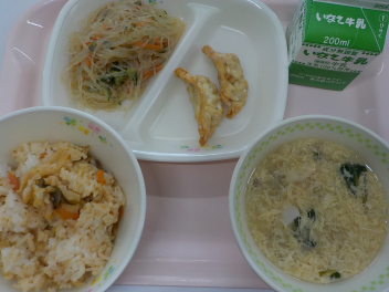 今日の給食は 「 キムチごはん 牛乳 あげぎょうざ たまごとたけのこのちゅうかスープ はるさめサラダ 」でした 今日は、井伊谷小学校のリクエスト献立でした。みんなが食べたい人気のメニューを意識して、献立をリクエストしました。 餃子は、中国から伝わってきた料理です。日本では、皮が薄い「焼き餃子」としてよく食べられていますが、中国では皮の厚い「水餃子」が一般的だそうです。浜松市のお店で餃子を注文すると、一緒にもやしがついてくることがあります。餃子にもやしを添えるのが、浜松餃子の特徴です。 今日の浜松産の食材・・・牛乳 、豚肉、チンゲン菜