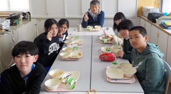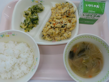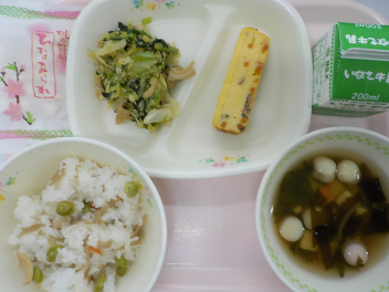 今日の給食は 「 ごもくずし 牛乳 ひなあられ ちぐさあえ あられはんぺんすましじる ごもくあつやきたまご 」でした 今日は、他の学校行事の関係で、一足早い『ひな祭りの行事食』でした。3月3日はひな祭りで、「桃の節句」とも言います。ひな人形を飾り、甘酒やひなあられを食べてお祝いをする、女の子のお祭りです。女の子が健康に育ちますようにと願いを込めて、ちらし寿司を食べたり、はまぐりのすまし汁を飲んだりしてお祝いをする日です。 今日の浜松産の食材・・・牛乳 、三つ葉