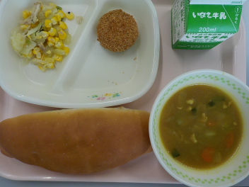 今日の給食は 「 りんごチップいりロールパン 牛乳 さつまいもコロッケ セロリのソテー はくさいのカレースープ 」でした 今日は、浜松パワーフード給食の日でした。浜松産の食材は、牛乳、セロリ、小松菜、豚肉、玉ねぎです。またコロッケに使用されているさつま芋も浜松産です。地元浜松の恵みに感謝しながら、味わって食べることができました。 今日の浜松産の食材・・・牛乳、セロリ、小松菜、豚肉、玉ねぎ