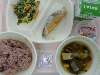 今日の給食は 「 せきはん 牛乳 ごましお わかたけじる さけのあげびたし ごまあえ そつぎょういわいゼリー 」でした 赤飯は、もち米に小豆を混ぜて蒸したご飯です。小豆などの汁で赤くなるので、赤飯といいます。赤飯は、お祝いの食事に欠かすことができないものです。食べる時にはごま塩をふりかけますが、そのごまも切ったり炒ったりすると縁起が悪いとされています。 今日の浜松産の食材・・・牛乳、小松菜