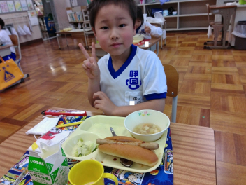 ・わかめごはん ・牛乳 ・鳥のから揚げ ・味噌けんちん汁 ・お祝いクレープ