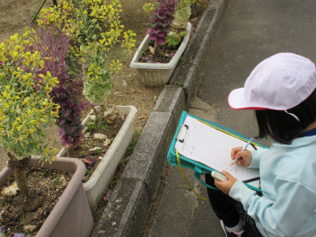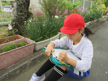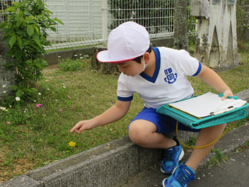 「ピンク色の花だけれど、濃いピンクと薄いピンクの花びらがあるよ。」「この花の大きさはビー玉くらいかな?」「この花はほとんどかおりがないと思う。」「この虫は真っ黒だ。」「このふくらみは実になるのかな?」