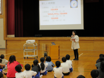 休み時間が10分となること、「なかよしタイム」は元気に外で遊んでほしいことなど、ルールとともに先生たちの思いも伝えました。