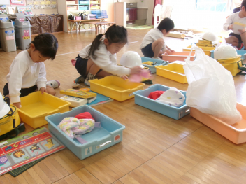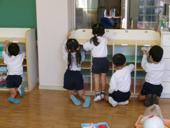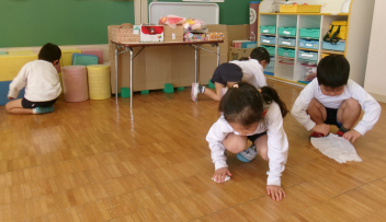 子供たちから遊具をきれいにしたい!という声が聞かれたため、今日は、遊具の大掃除を行いました。雑巾を手に持つと、張り切って園庭に向かう子供たち。