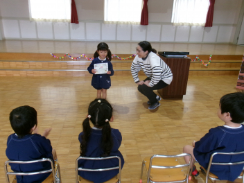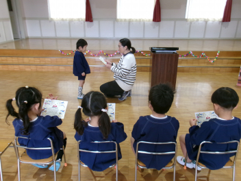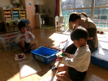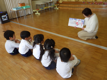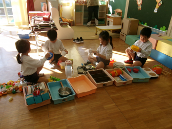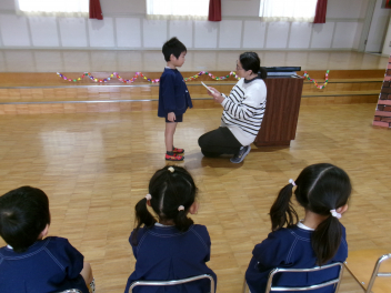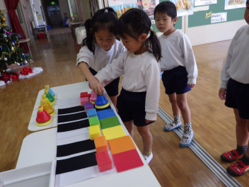 園にあるベルとは違ったハンドベルに少し緊張気味の様子の子も、「できたね!」と、言葉や拍手で認めてくれるため、楽しさを感じながら意欲的に表現することができました。時間が経つにつれ、素敵な音色を感じて、もっと鳴らしていたいような様子の子供たちでした。