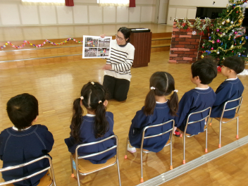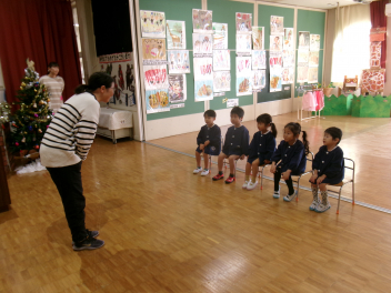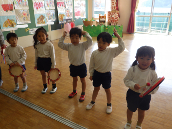 最後は、タンバリン、すず、カスタネット、太鼓などの楽器を自分で選び、「あわてんぼうのサンタクロース」の曲に合わせてリズム打ちも楽しみました。