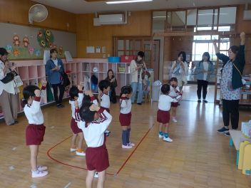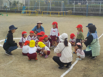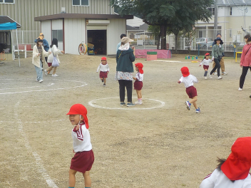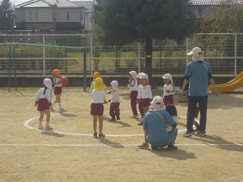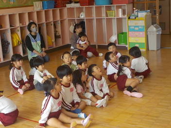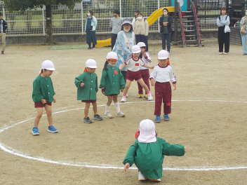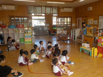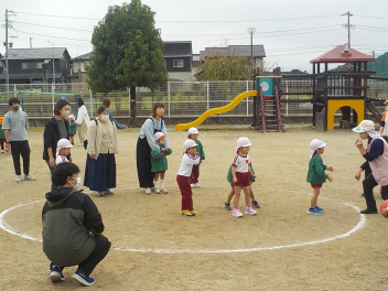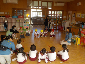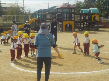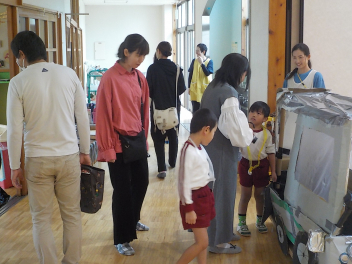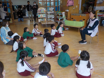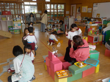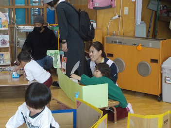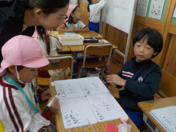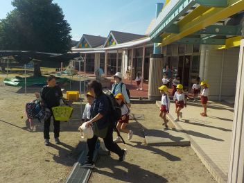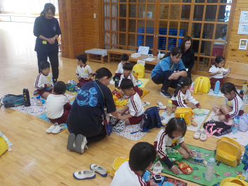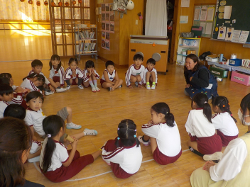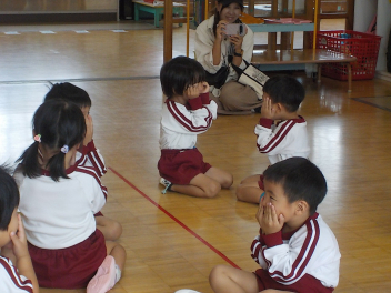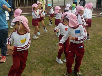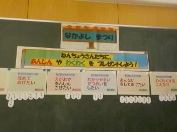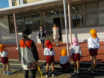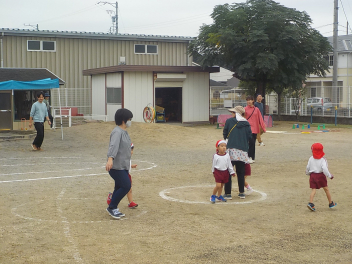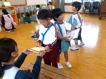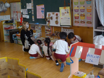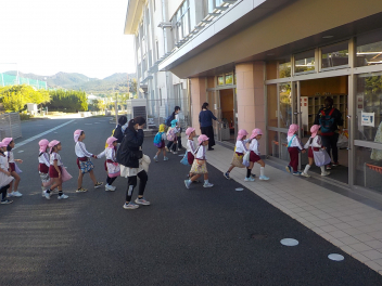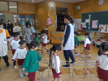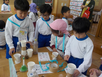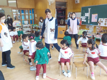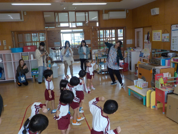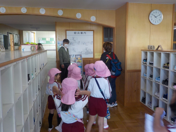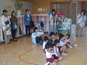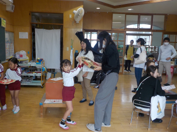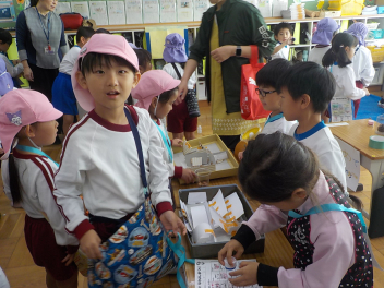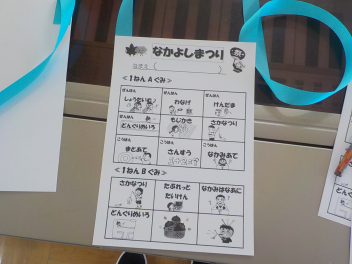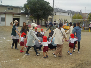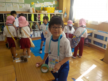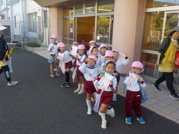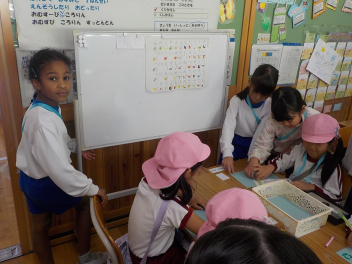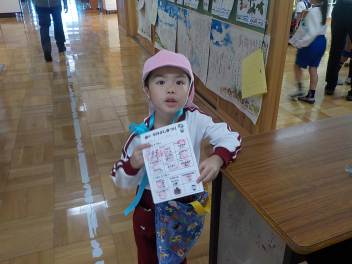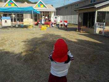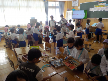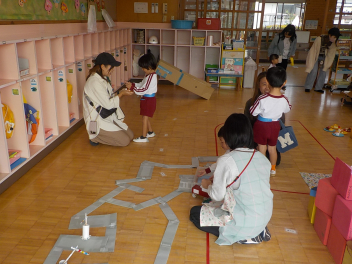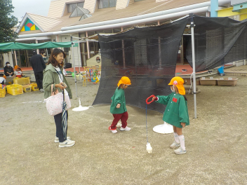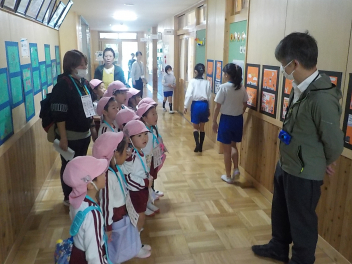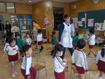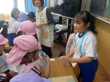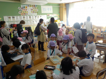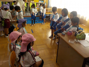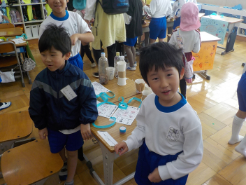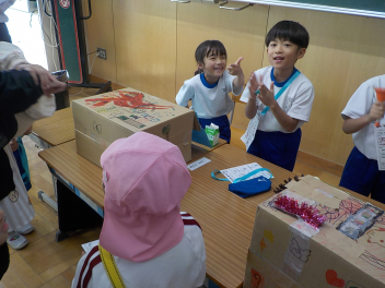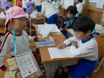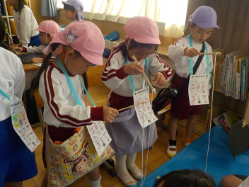 ちょっと堅い話ですが・・・。本園は、卒園児のほぼ全員が井伊谷小学校に進学することから、小学校生活に円滑に移行できるように、本園の年長児と井伊谷小1年生の2年間を「架け橋期」として、小学校と連携して教育計画を作っています。この計画を「架け橋プログラム」と言い、2年目を迎えました。本年度は、園から「生活科の授業に参加させてほしい」と依頼したところ、本日の生活科「なかよしまつり」に招待してくださいました。みんなで行ったところ、なんと本園だけでなく、引佐保育園・伊平幼幼稚園も一緒でした。小学校のやる気満々の姿勢に脱帽です