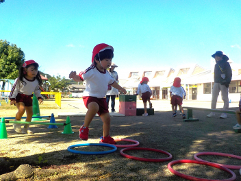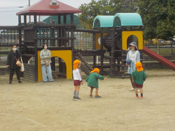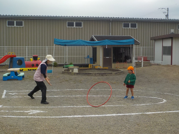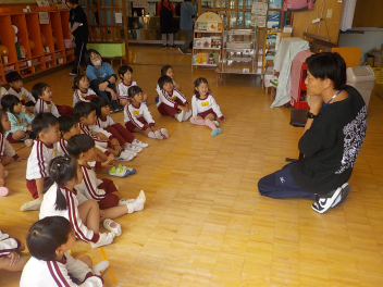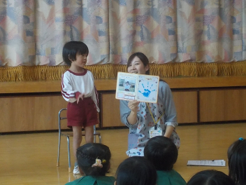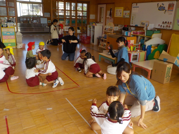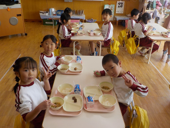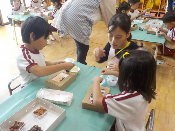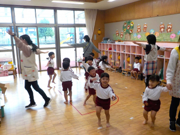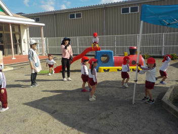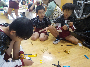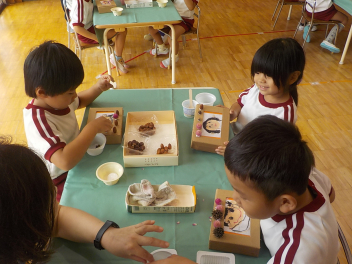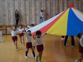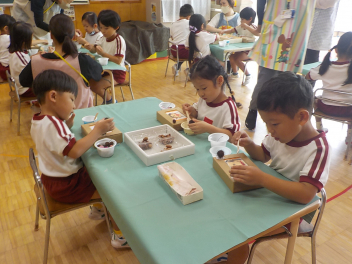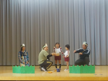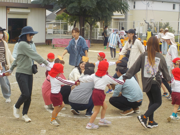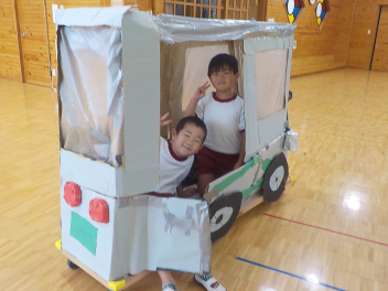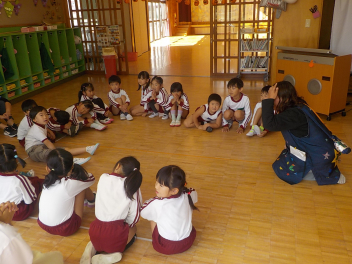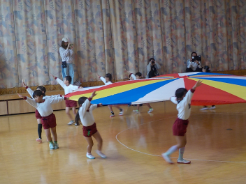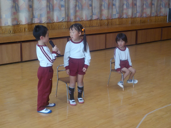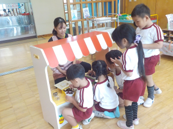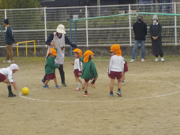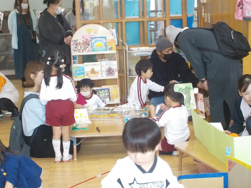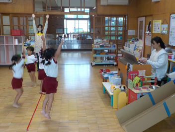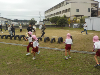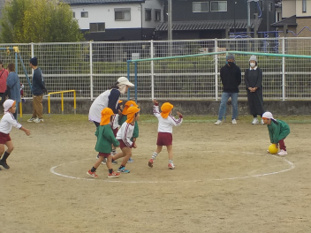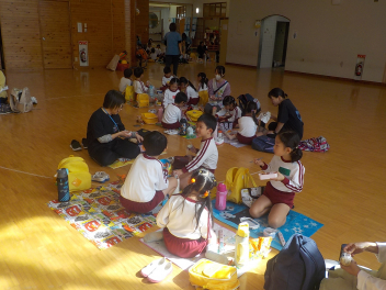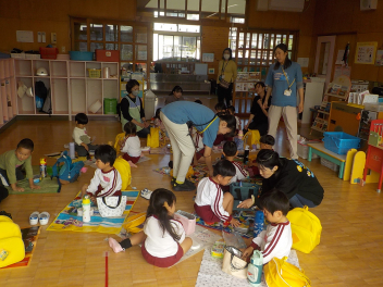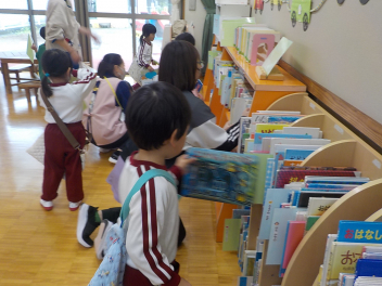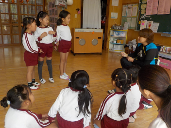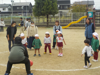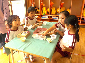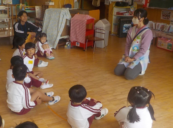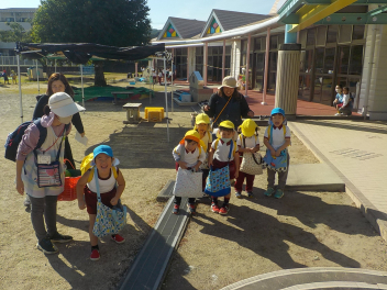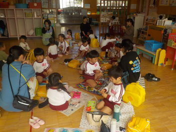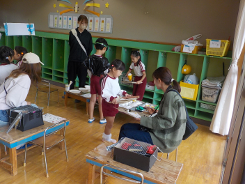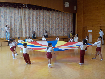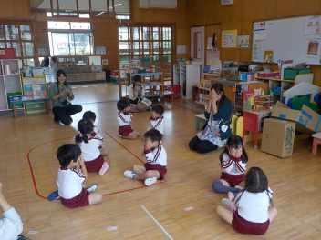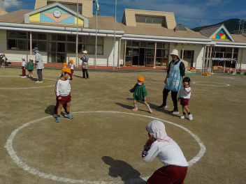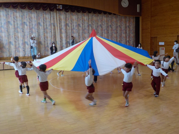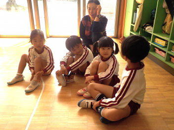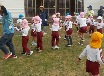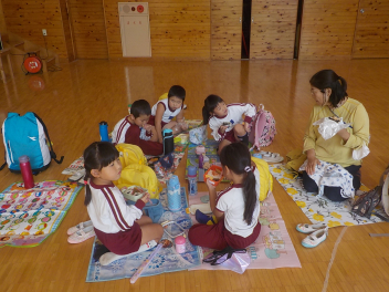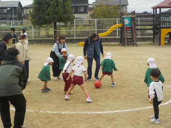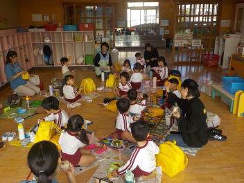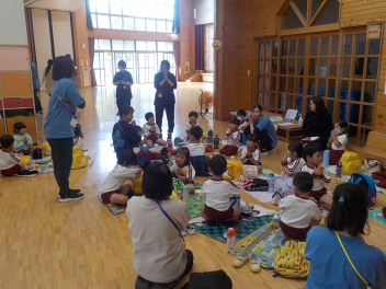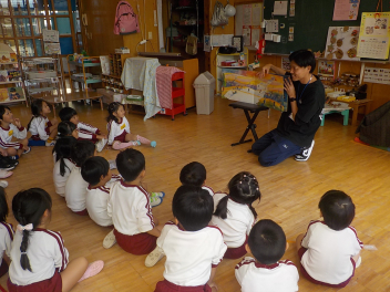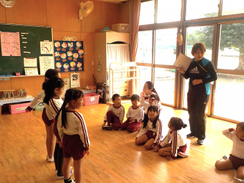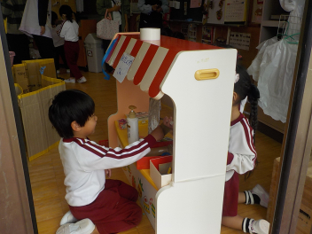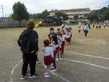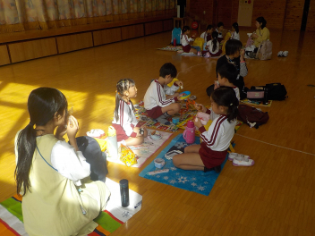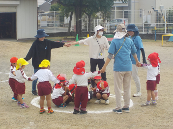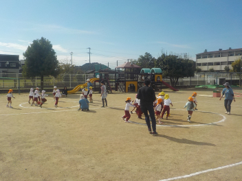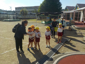 ちょっと堅い話ですが・・・。本園は、卒園児のほぼ全員が井伊谷小学校に進学することから、小学校生活に円滑に移行できるように、本園の年長児と井伊谷小1年生の2年間を「架け橋期」として、小学校と連携して教育計画を作っています。この計画を「架け橋プログラム」と言い、2年目を迎えました。本年度は、園から「生活科の授業に参加させてほしい」と依頼したところ、本日の生活科「なかよしまつり」に招待してくださいました。みんなで行ったところ、なんと本園だけでなく、引佐保育園・伊平幼幼稚園も一緒でした。小学校のやる気満々の姿勢に脱帽です