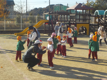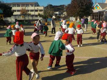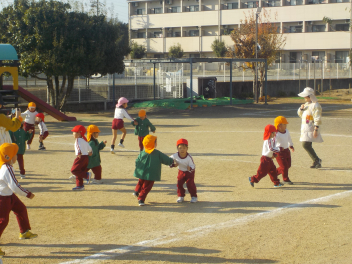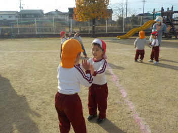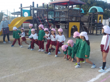 昨日よりさらに冷え込んだ今朝の温度は3℃でも子どもたちは元気いっぱいwink特に年中組さんは、「学芸会ごっこ」のダンスが大好きで、ノリノリでしたその後のしっぽ取りゲームでも、みんなで応援し、みんなで走り回りました頼もしい年中組さんです