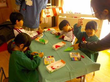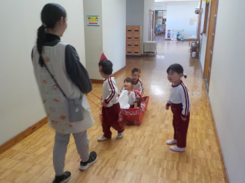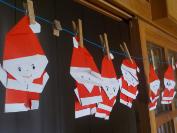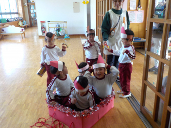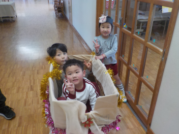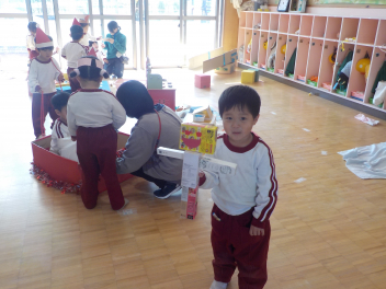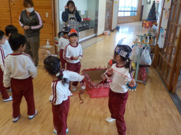 幼稚園のあちらこちらに、クリスマスがいっぱいです年中組さんから始まった段ボール製のソリが、年少組に向かい、そして年長組さんへ最後は、年少組さんと年長組さんがペアを組んで、「ジングルベル」を踊りましたsmileyサンタさんごっこの輪が広がっています。明日の展開が楽しみです