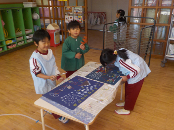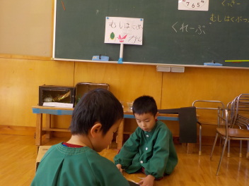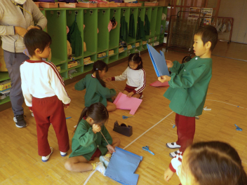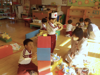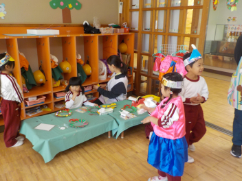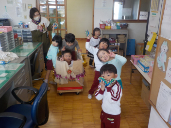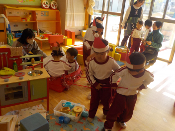 「学芸会あそび」はお部屋の中でも続きます。今日は、年少組さんと年中組さんが衣装を交換し合って、ステージで一緒にダンスをしていました。かわいい徐々に年中組さんが、お兄さん・お姉さんになっていきます来年の引佐幼稚園を頼んだぞ