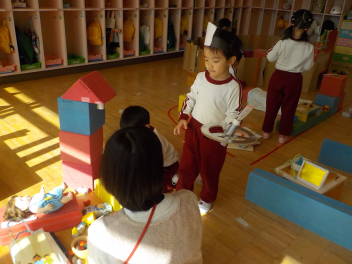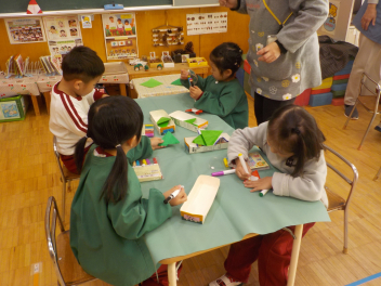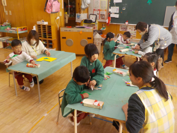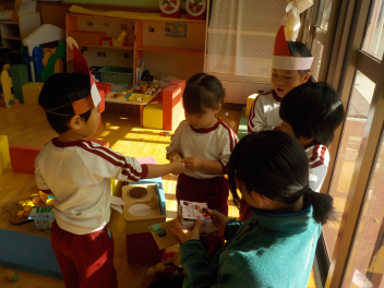 年少組さんは、お部屋の中で「サンタさんごっこ」をしていました。年中組さんは、クリスマスグッズの制作をしていました。年長組さんは、新たなお店屋さんごっこの準備をしていました。子どもたちは場所を変えながら、自分の思いを遊びの中で実現しようと頭と体をフルに動かしています。これらの積み重ねが成長を促します。教育相談を通して、お家では見られないお子さんの様子を、いっぱいお伝えしています。