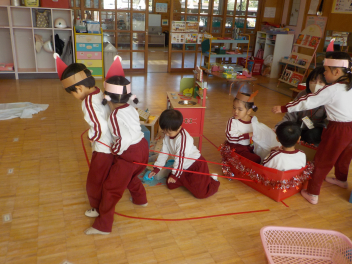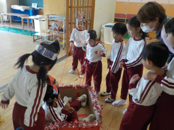 今日は朝からどんよりした曇り空で、今にも雪が舞いそうでしたが、子どもたちは元気でした今日は年少組さんが中心となって、「学芸会あそび」をしていました。立派に成長している年少組さんです