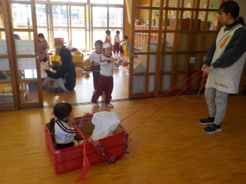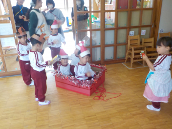 明日はお楽しみ会サンタさんがやってきます年少組さんと年中組さんは、そり遊びを楽しみました。年長組さんは、ジングルベルのダンスをしました。気持ちは既にクリスマスですサンタさーん、待ってるよcheeky