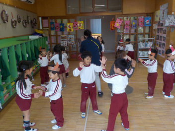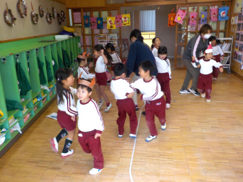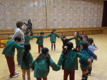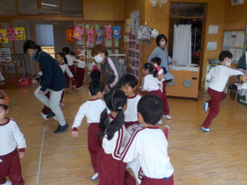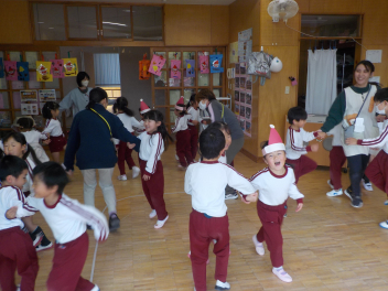 マラソンの後は、お友だちと二人組を作って「ジングルベル」のダンスをしました。ペアづくりは、大人が動けばすぐにできるのに、先生たちは、黙って、じっと待っています。はたから見ると、「無用な時間」に見えますが、この時間こそが、「人との関係づくり」の意味と価値を、自ら経験を通して認知しているのです。