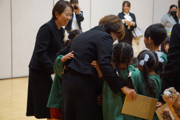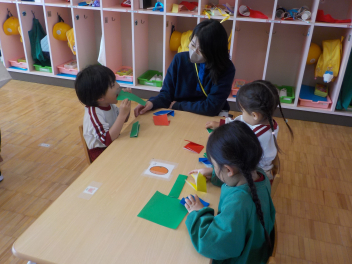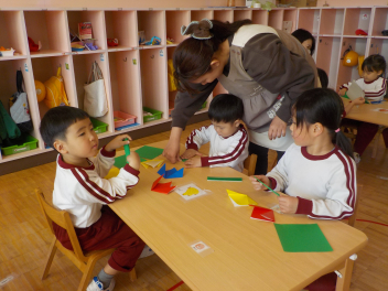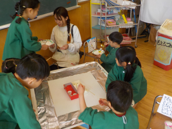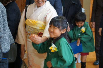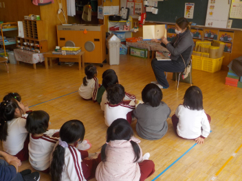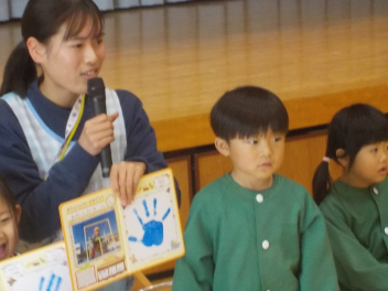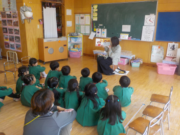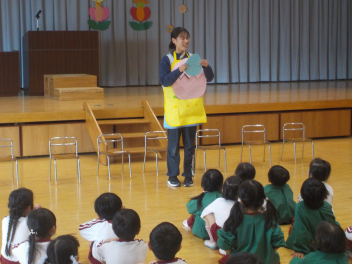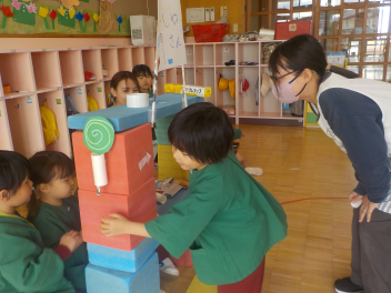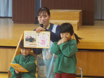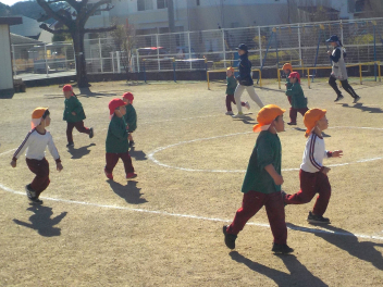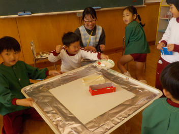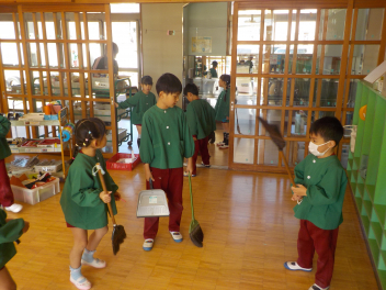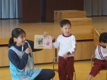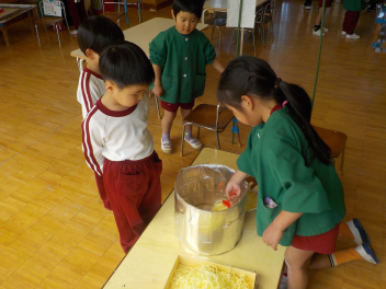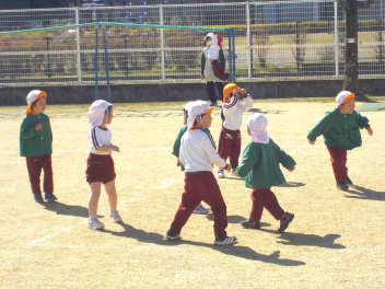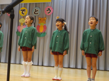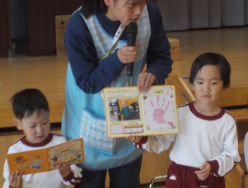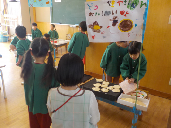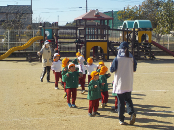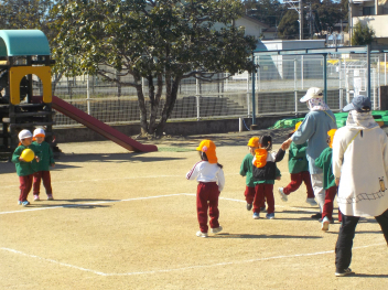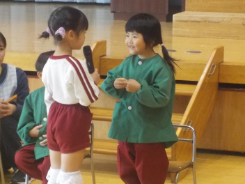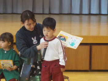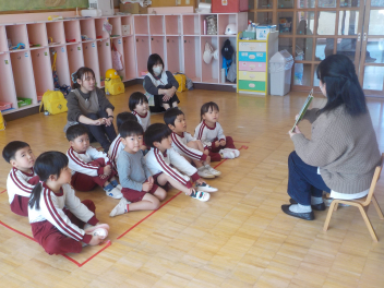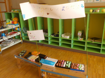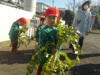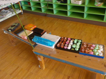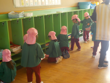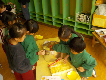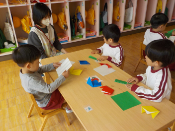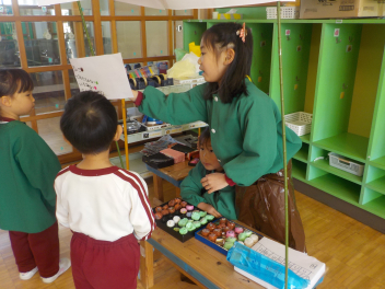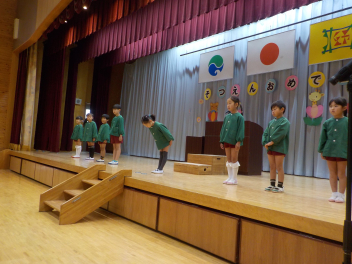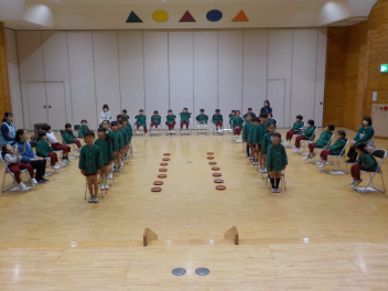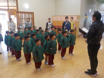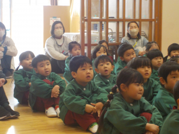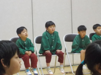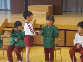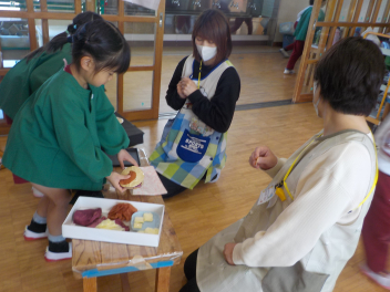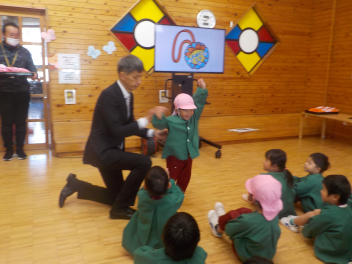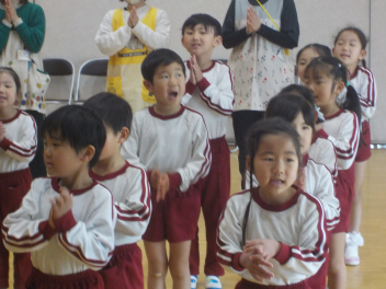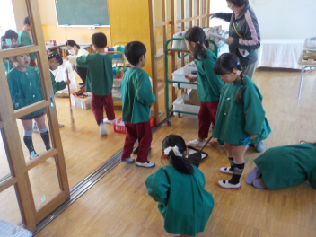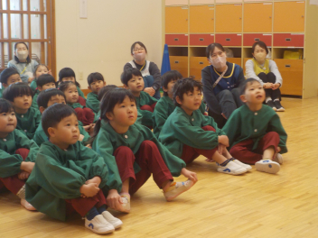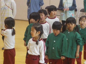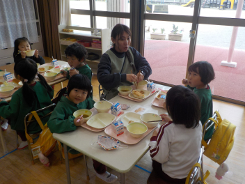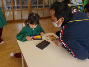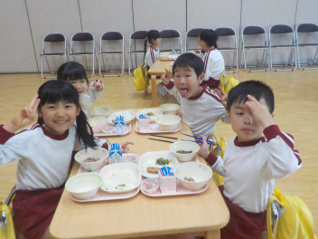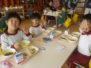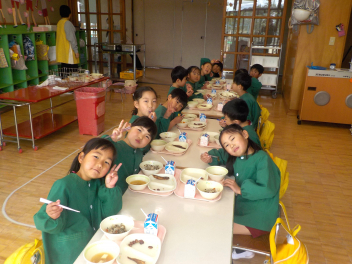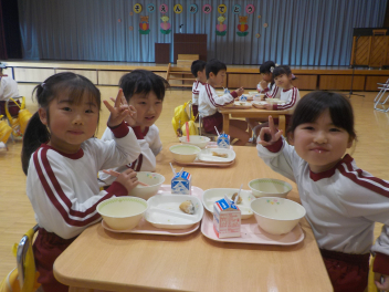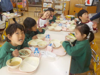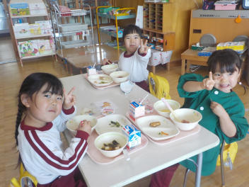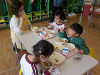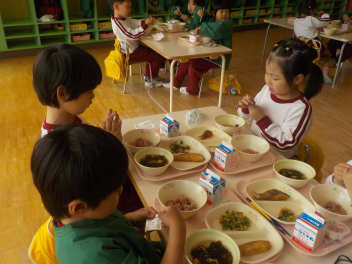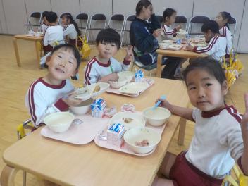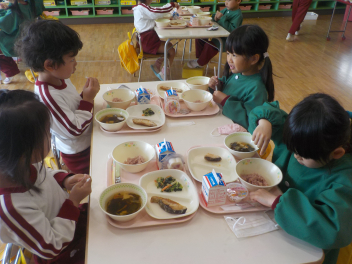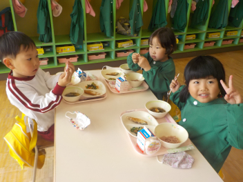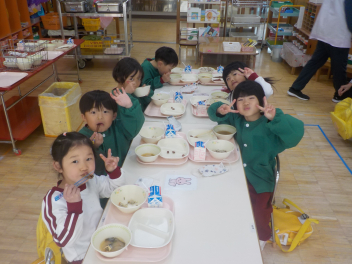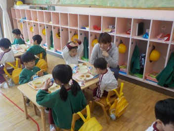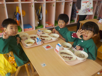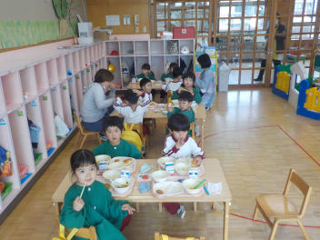行事食にちなんで、先生も入れ替わって、年少組さんは年中組さんのお部屋で、年中組さんは年長組さんのお部屋で、年長組さんは「なかよしらんど」で給食をいただきました。みんな、一回りも二回りも大きく見えました