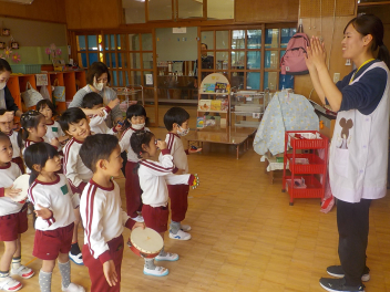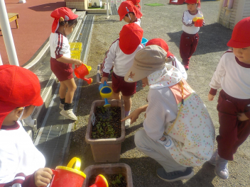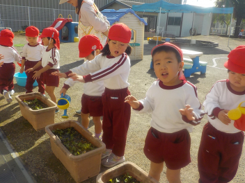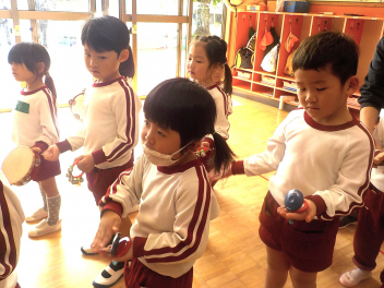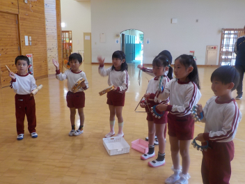 3連休明けの今日から、11月の園生活が始まりました。11月は秋と冬の境目です。今朝の冷え込みは冬だけど、日中は秋晴れ。体調管理に気を付けて、11月も元気に乗り切りたいものです。年少組さんは、育てているラディッシュがぐんぐん伸びています。水かけをして、「大きくなーれ」の声を掛けていました年中組・年長組さんは、学芸会に向けて楽器遊びをしていました。どんな演奏になるのか楽しみです