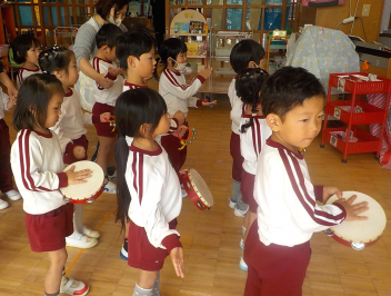 本園は、来年度も5歳児健康診査モデル事業に引き続き参加していき、改善を提言していきます。年少組さんの保護者の皆さん、ご協力の程をよろしくお願いします。園庭で遊べない年少組さんは、お部屋の中で、音楽に合わせて体をいっぱい動かしました。