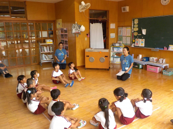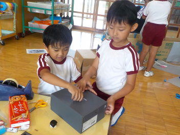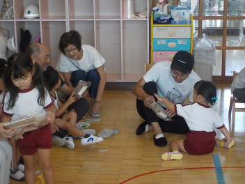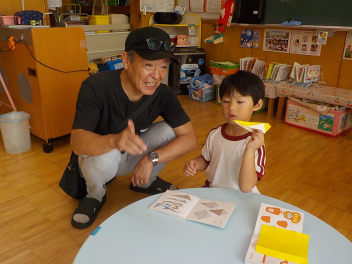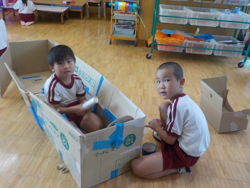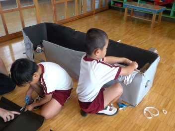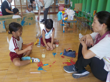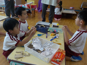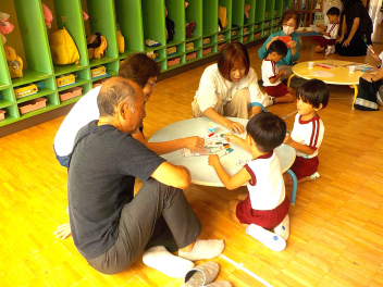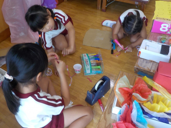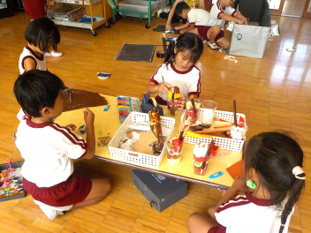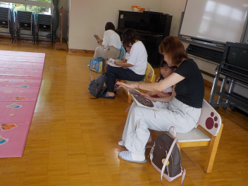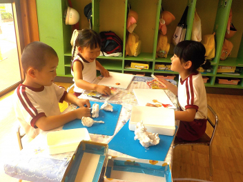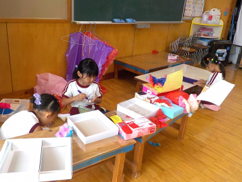 お部屋の中では、年長組さんが、椅子に座って工作や読書・粘土をしていました。小学生ぽいなあ