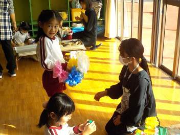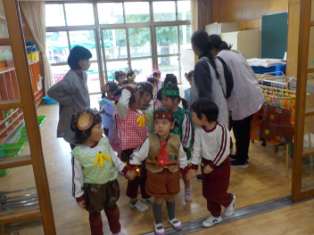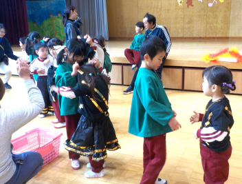 「学芸会あそび」はお部屋の中でも続きます。今日は、年少組さんと年中組さんが衣装を交換し合って、ステージで一緒にダンスをしていました。かわいい