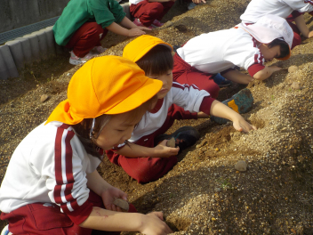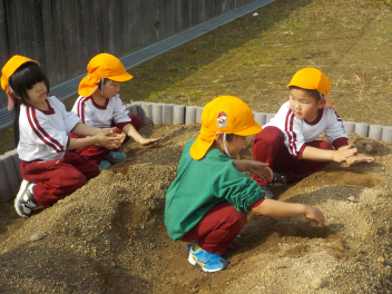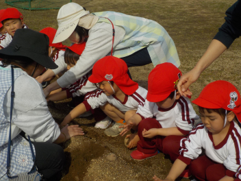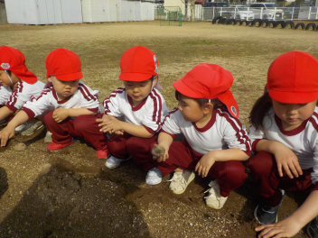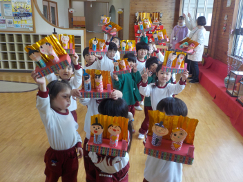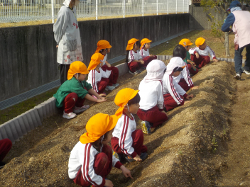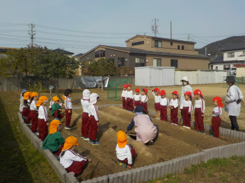 園児玄関前には、年少組さん・年中組さん・年長組さんのひな飾りが飾られ、明日の「ひなまつり会」を待つばかりです。今日は、年少組さんと年中組さんが、ジャガイモを植えました。