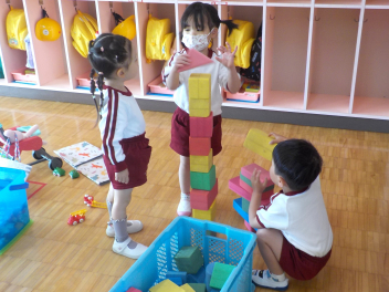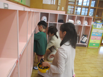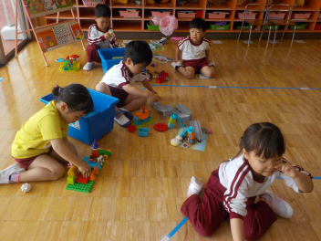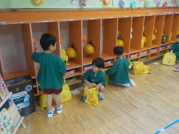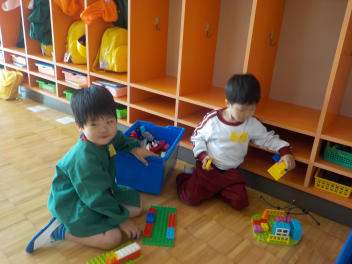 「春の嵐」の中で行われた始業式・入園式は大変でしたね。お疲れさまでした。今日から生活が始まりました。年長組さんによる「欠席調べ」から始まり、身支度が終えた子から自由あそび。新しい環境での生活に慣れるまで、ゆったりとした時間を過ごしていきます。