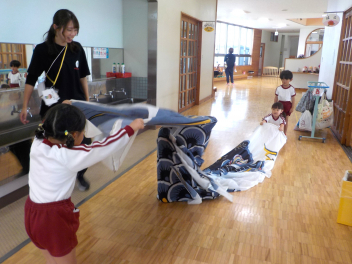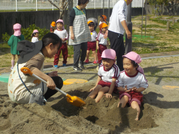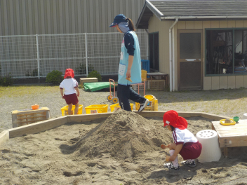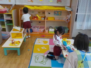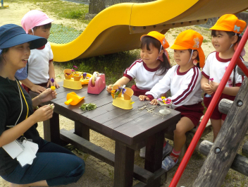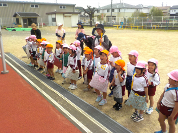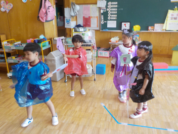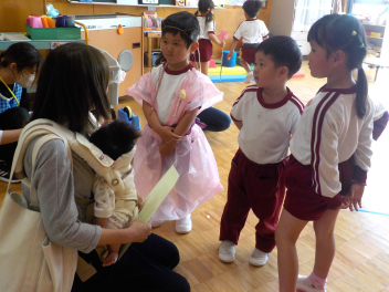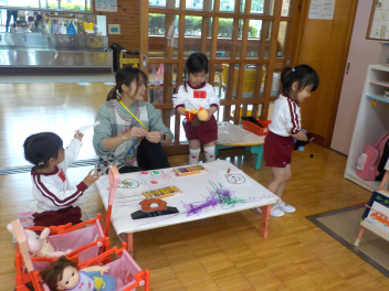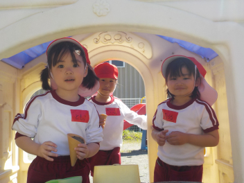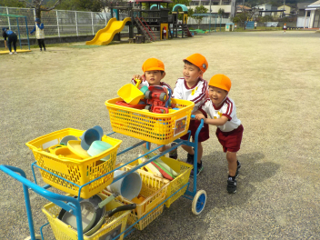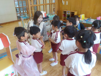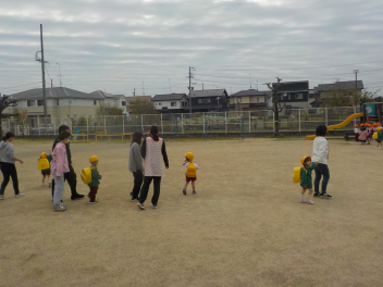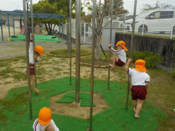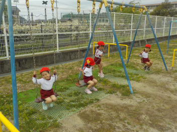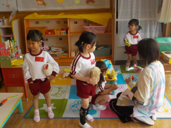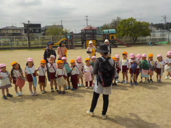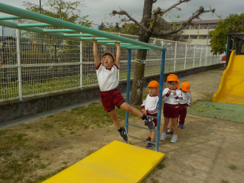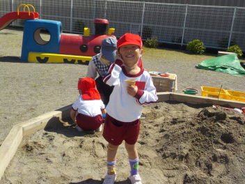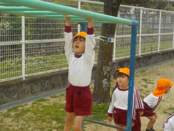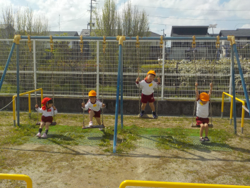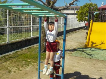 身支度を終えた子どもたちは、お日様がいっぱいの園庭に出て、思い思いの遊びをしていました。チョウチョとつかまえた子、春探しをする子、ダンゴムシをみつけた子、砂遊びをする子、お店屋さんごっこをする子、ブランコ・雲梯・鉄棒にチャレンジする子などなど、遊びの種類が増えました。お部屋の中でも、遊びが広がっていて、早速、変身遊びが始まりました。給食も美味しくいただきました。明日は金曜日。子ども先生たちも、疲れが出てきていますが、あとひと頑張りです。明日も待ってまーすcheeky
