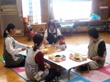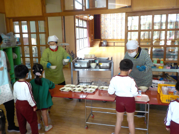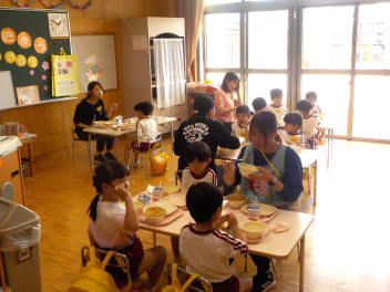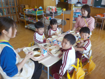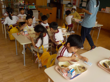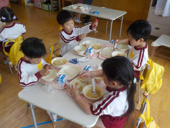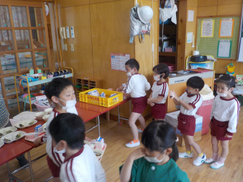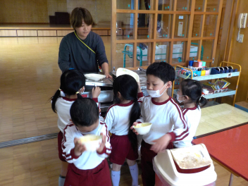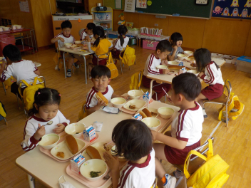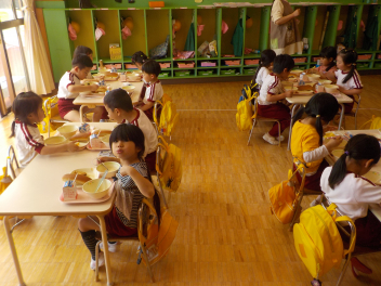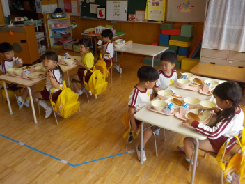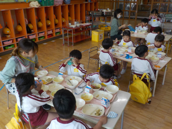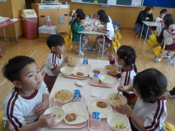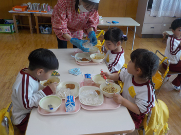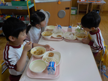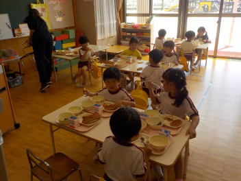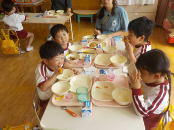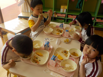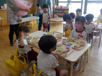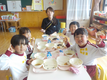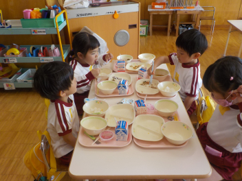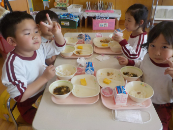 年少組さんは5月1日までは、午前11時に降園します。働く保護者の皆さん。申し訳ないですangel年中組さん・年長組さんは、今日から給食がスタートしました。引佐学校給食センターのおいしくて、栄養バランスが良くて、温かくてお得な給食は、本当にありがたいです。明日の給食も楽しみですcheeky