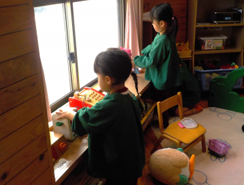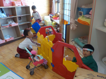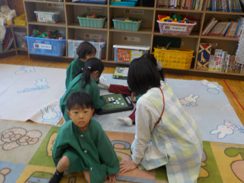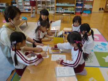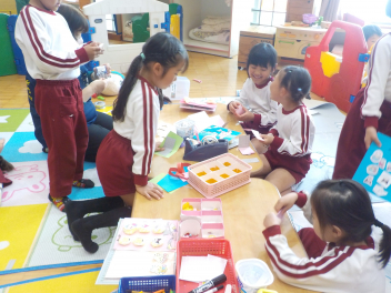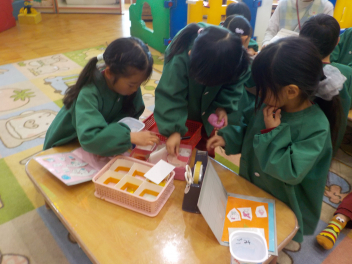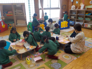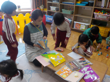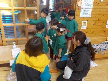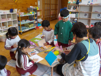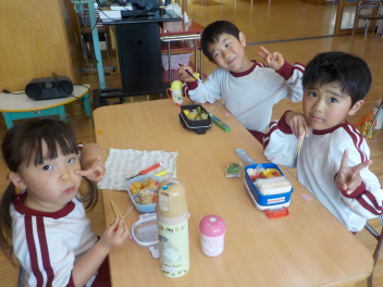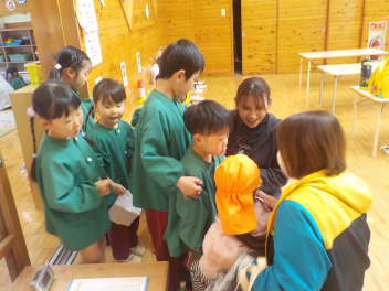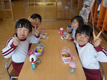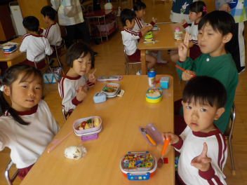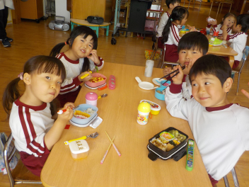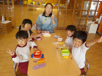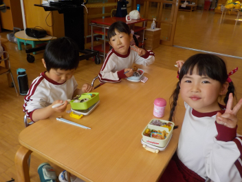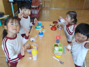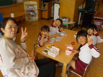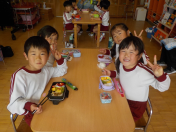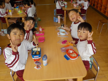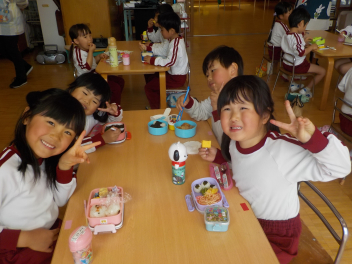 行事食にちなんで、先生も入れ替わって、年少組さんは年中組さんのお部屋で、年中組さんは年長組さんのお部屋で、年長組さんは「なかよしらんど」で給食をいただきました。みんな、一回りも二回りも大きく見えました