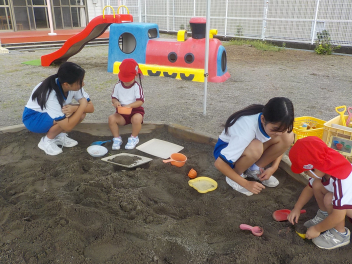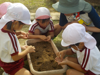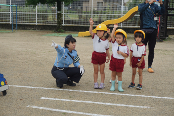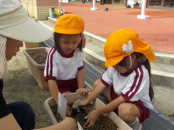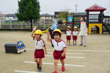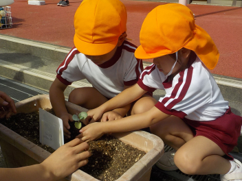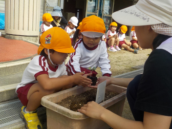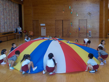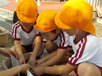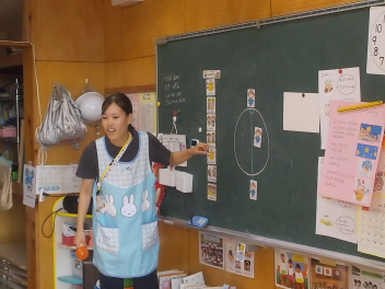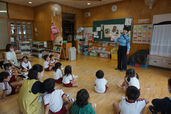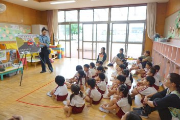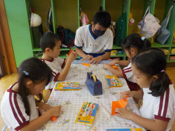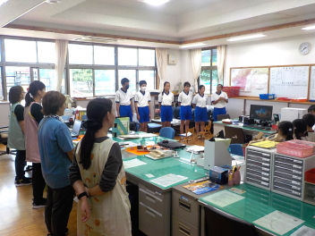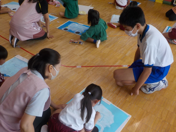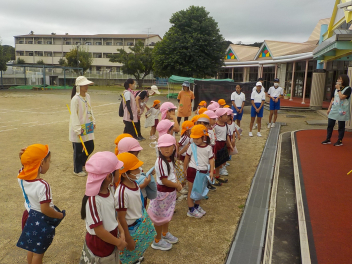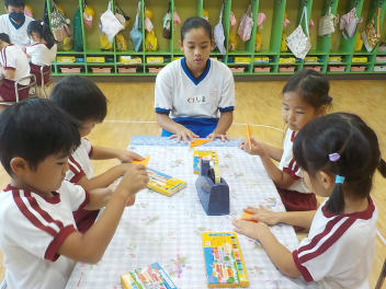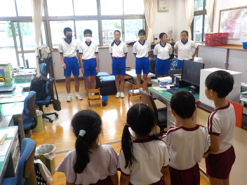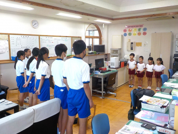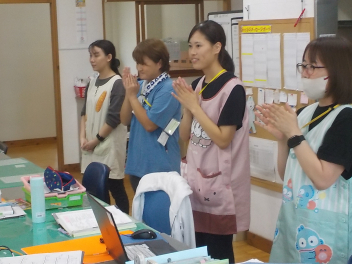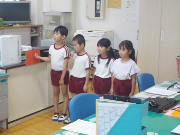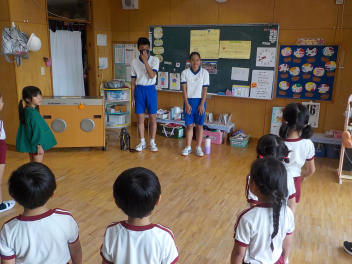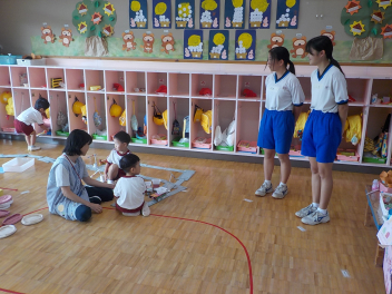 園児の降園後には、教材づくりや器具庫の整とんを手伝ってくれました。最後は、職員室で預かり保育に参加している年長組さんと先生方とで「職場体験学習解散式」を行いました。中学生から感想を発表してもらった後に、年長組さんがお礼の言葉を一人ずつ発表しました。中学生も子どもたちも立派でした