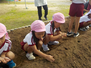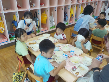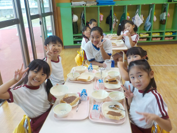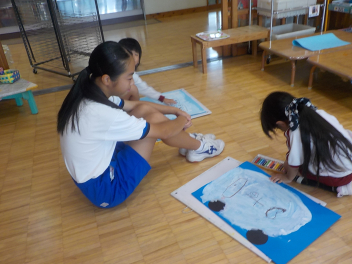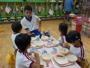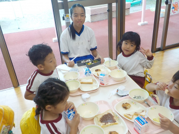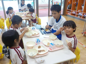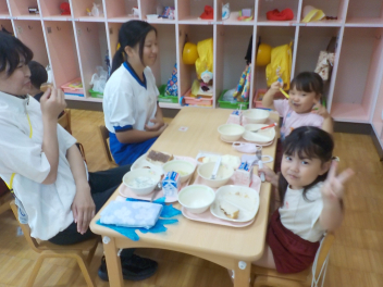 お昼ご飯も、お兄さん・お姉さんと一緒に食べました。子どもたちのテンションはどんどん上がり、留まるところを知りません。中学生の皆さん一人一人の存在が、子どもたちを始め、私たち職員もウキウキさせてくれました。「働くこと」「生きること」の意味もそこなのかもしれません。中学生の皆さん、本当にありがとうございました