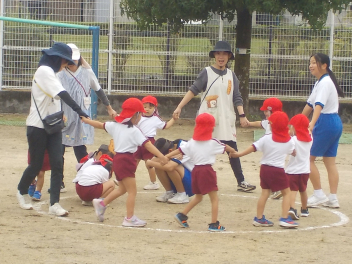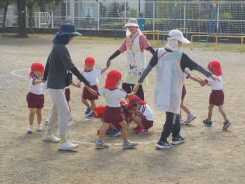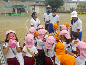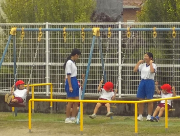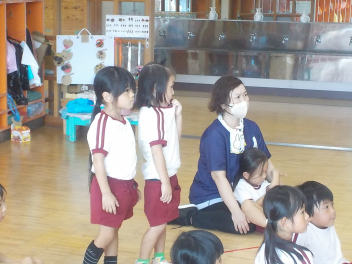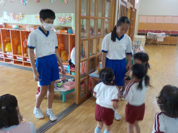 今日は、引佐南部中学校の2年生6人が「職場体験」として、本園に来てくれました。初めは、恐る恐る接していた子どもたちでしたが、時間が経ちにしたがって、どんどんテンションが上がっていきました。中学生たちも、初めは遠慮がちでしたが、時間が経つにつれ、表情が緩んでいきました。
