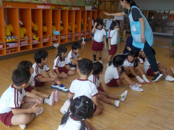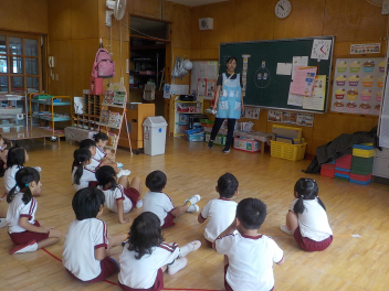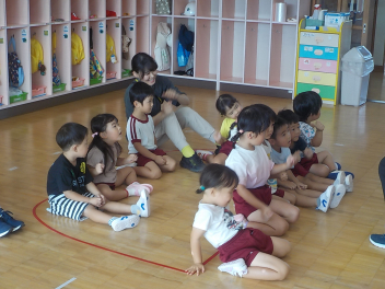 年も中組さんと年長組さんが引佐図書館に行きました。中学生の皆さんが、子どもたちの水筒を持ってくれました。助かりました